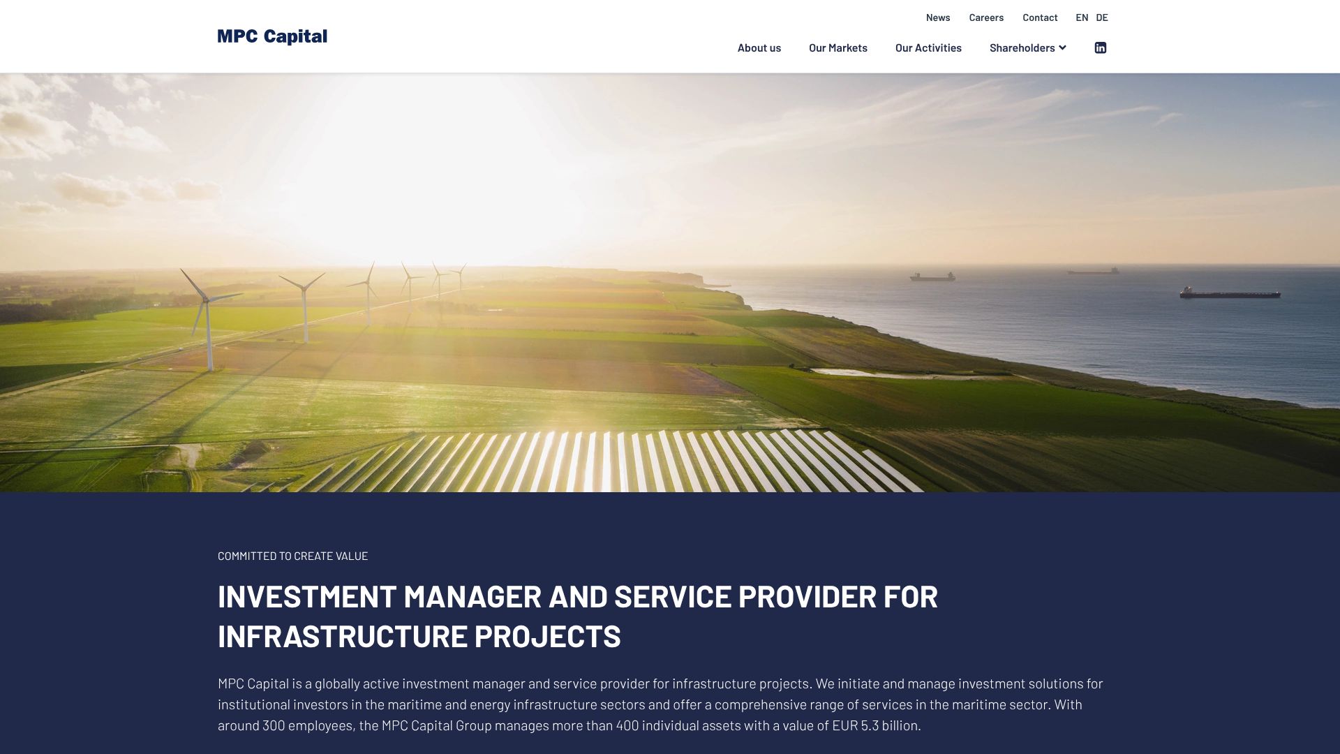 MPC Capital ist ein global agierender Investment-Manager und unternehmerischer Partner für Infrastrukturprojekte. Das Unternehmen entwickelt, finanziert und betreibt Projekte für institutionelle Investoren in den Bereichen Maritime und Energy. Der Firmensitz ist in Hamburg.