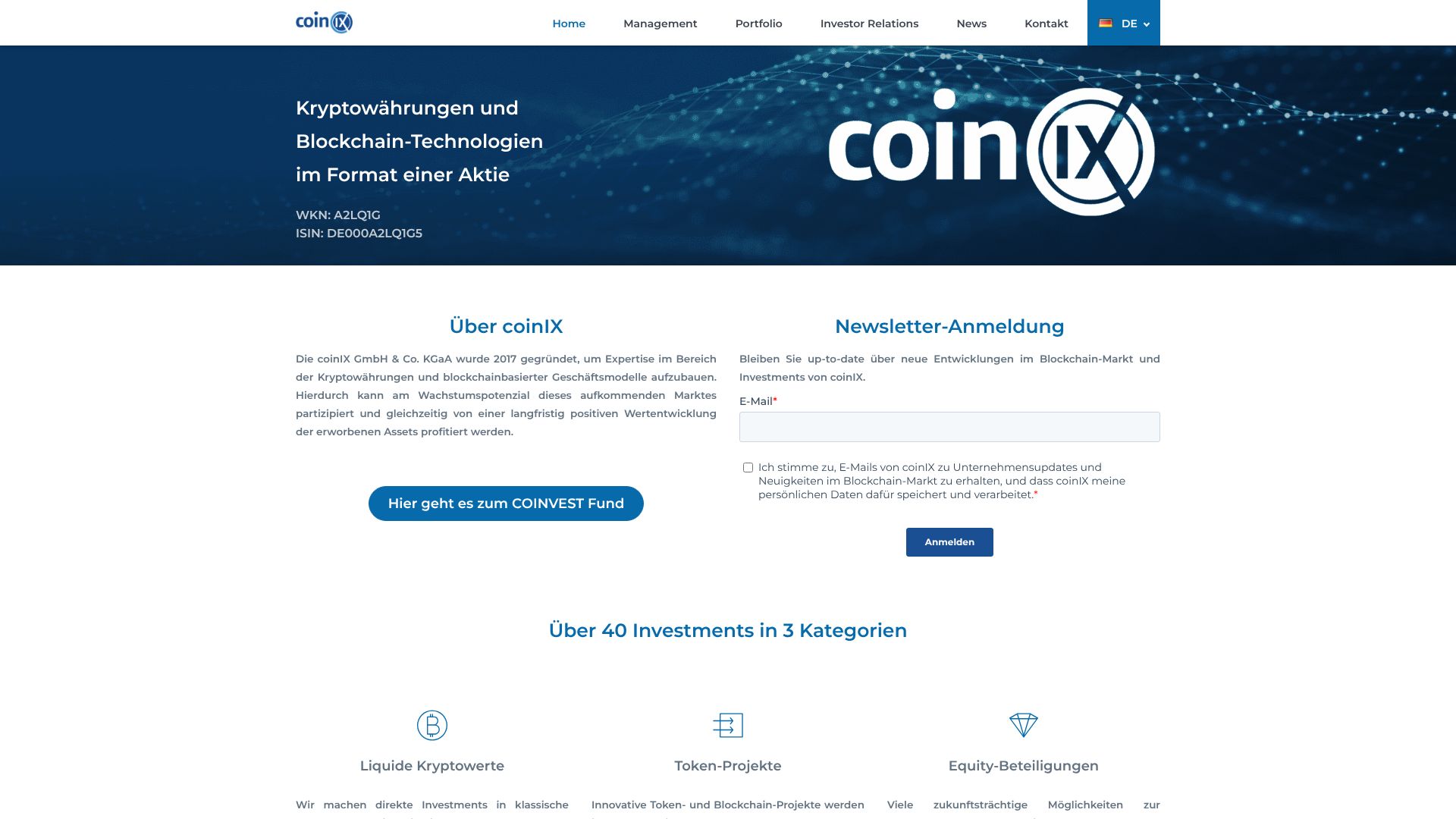 CoinIX ist eine Beteiligungsgesellschaft, die sich auf Kryptowährungen und Frühphasen-Engagements im Bereich Blockchain fokussiert. Der Firmensitz befindet sich im Hamburg. Gelistet ist die Aktie im Düsseldorfer Freiverkehr.