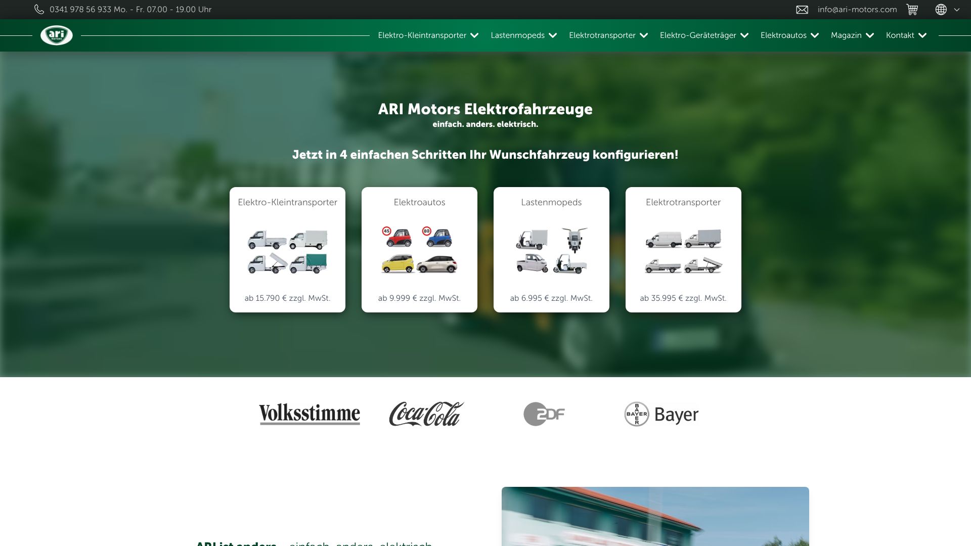 Die ARI Motors Industries SE bietet Elektrofahrzeuge – vom Auto bis zum Kleintransporter oder auch Lastenmoded – an. Der Firmensitz befindet sich im sächsischen Borna. Gelistet ist die ARI-Aktie seit Juli 2023 im Düsseldorfer Freiverkehr.