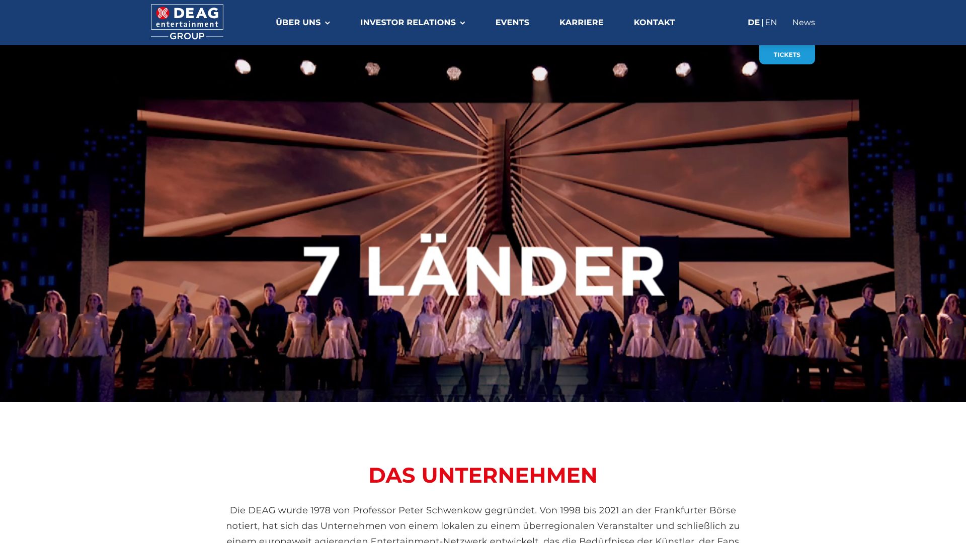 Die DEAG Deutsche Entertainment AG (DEAG) ist ein Entertainment-Dienstleister und Veranstalter von Live-Konzerten (Pop, Klassik, Familienunterhaltung). Die Kernmärkte der Berliner sind Deutschland, Schweiz und Großbritannien.