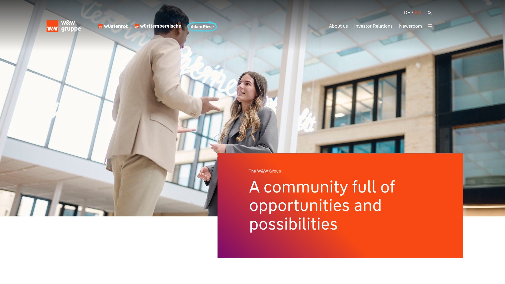Die Wüstenrot & Württembergische-Gruppe ist der Vorsorge-Spezialist für Absicherung, Wohneigentum, Risikoschutz und Vermögensbildung. Die Gesellschaft entstand 1999 aus dem Zusammenschluss von Wüstenrot und Württembergische. Firmensitz ist Stuttgart.