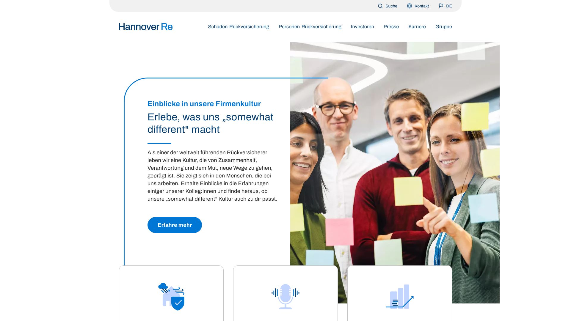 Hannover Rück ist der drittgrößte Rückversicherer der Welt und betreibt alle Sparten der Schaden- und Personen-Rückversicherung. Für das Unternehmen arbeiten weltwet rund 3.100 Mitarbeiter.