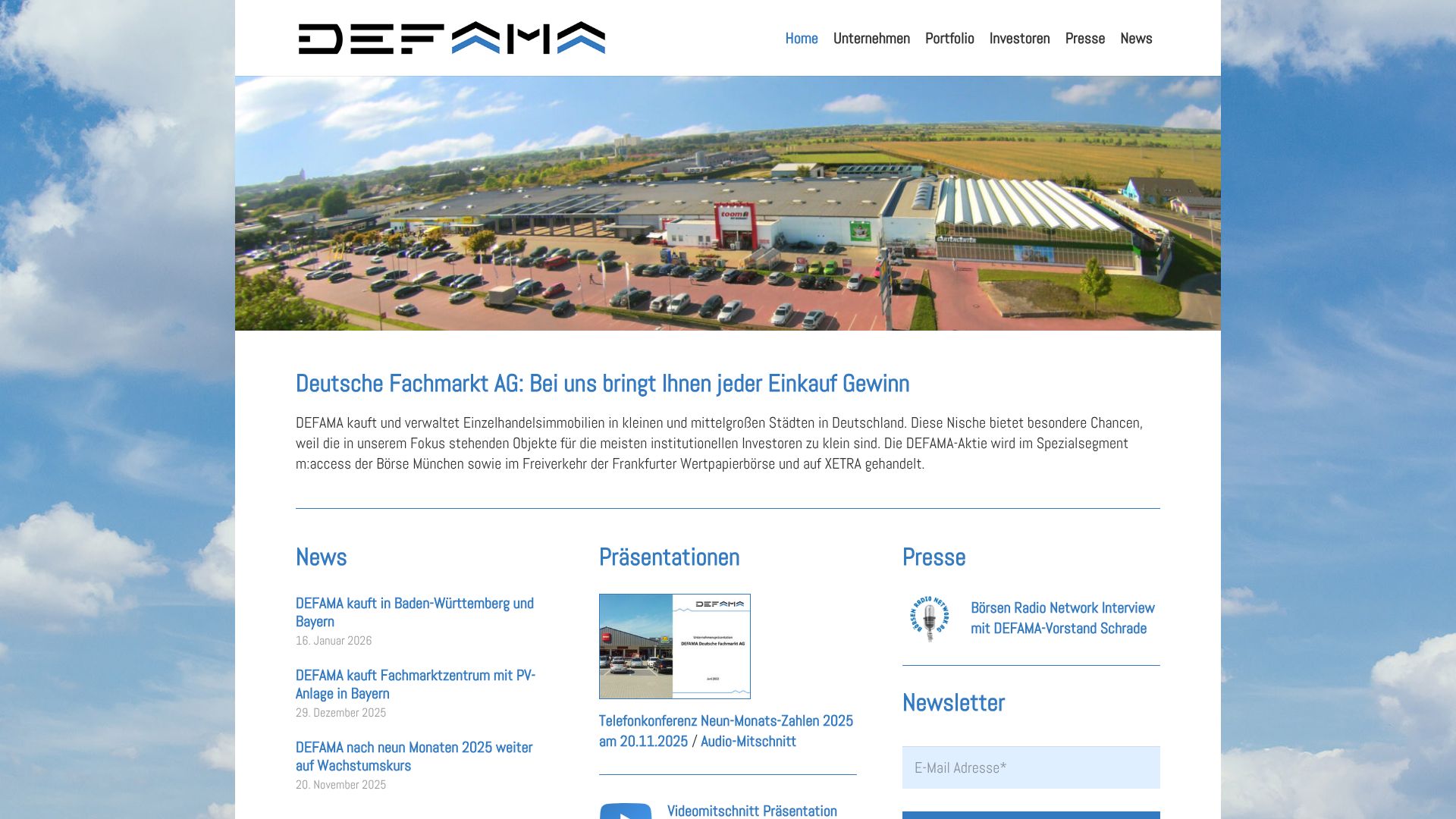 DEFAMA Deutsche Fachmarkt wurde 2014 gegründet. Schwerpunkt ist der Kauf von Supermarktimmobilien sowie deren langfristige Vermietung. In der Regel befinden sich die Objekte in mittelgroßen Städten Deutschlands.