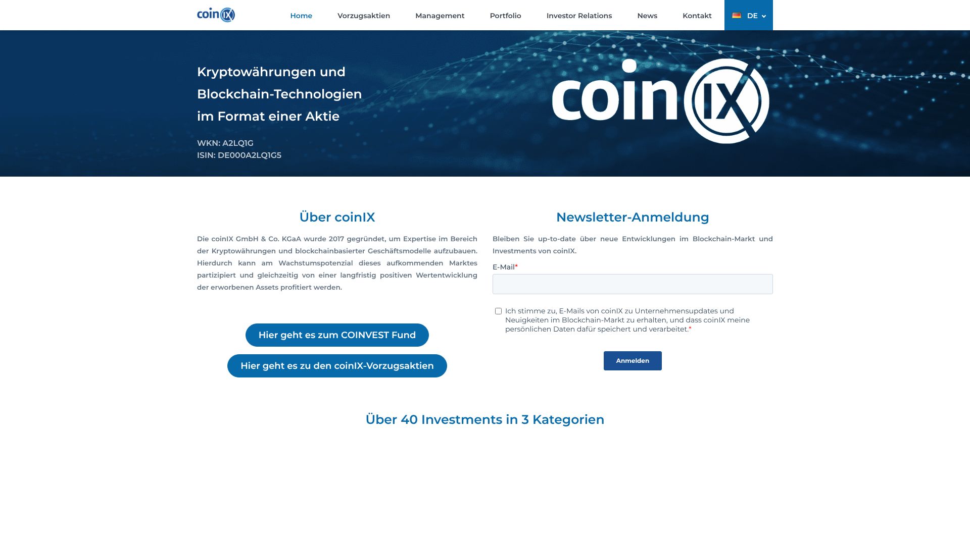 CoinIX ist eine Beteiligungsgesellschaft, die sich auf Kryptowährungen und Frühphasen-Engagements im Bereich Blockchain fokussiert. Der Firmensitz befindet sich im Hamburg. Gelistet ist die Aktie im Düsseldorfer Freiverkehr.