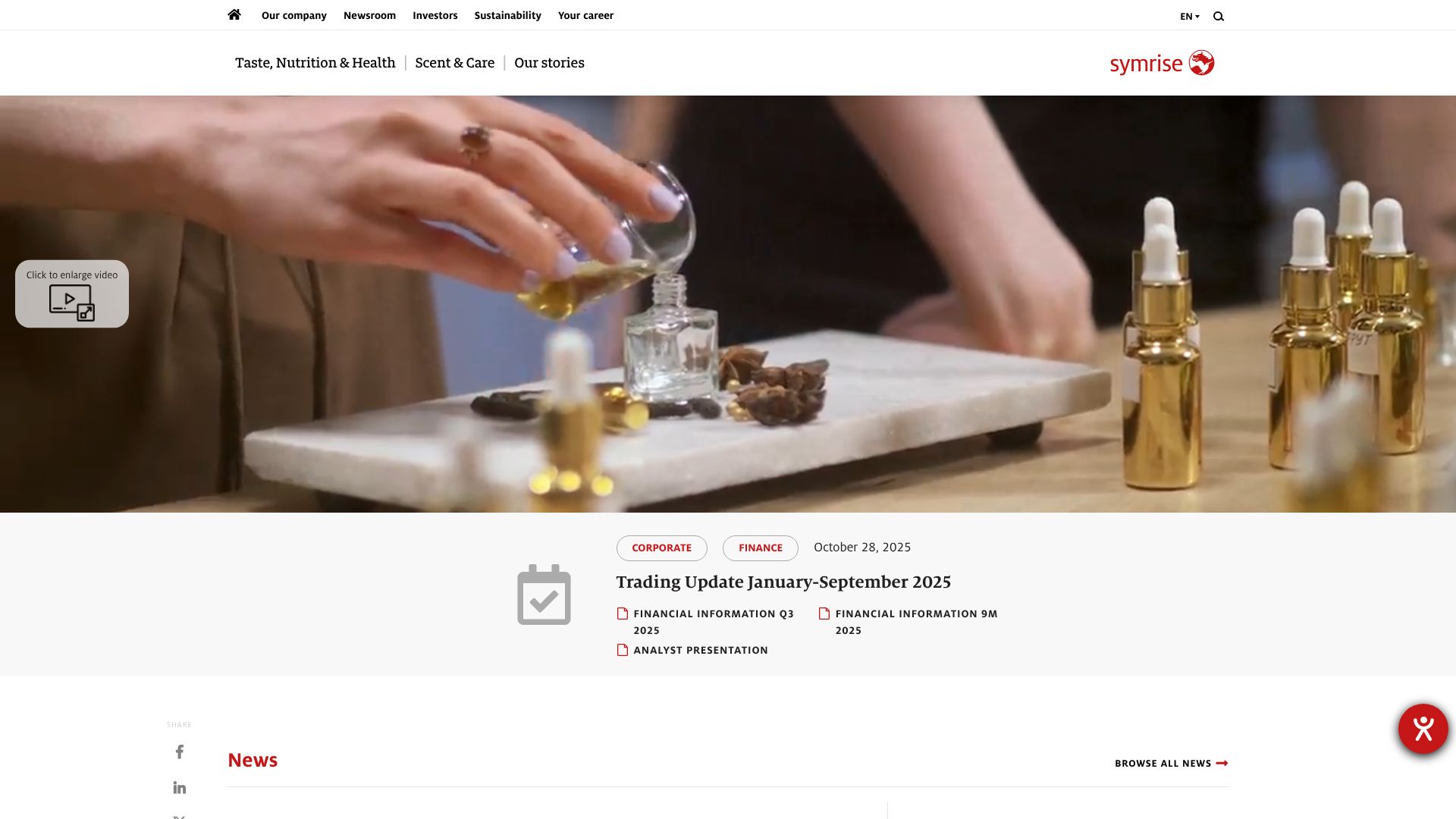 Symrise ist ein Anbieter von Duft- und Geschmackstoffen. Das DAX-Unternehmen ging im Dezember 2006 an die Börse und beschäftigt mehr als 12.000 Mitarbeiter. Der Firmensitz befindet sich in Holzminden.
