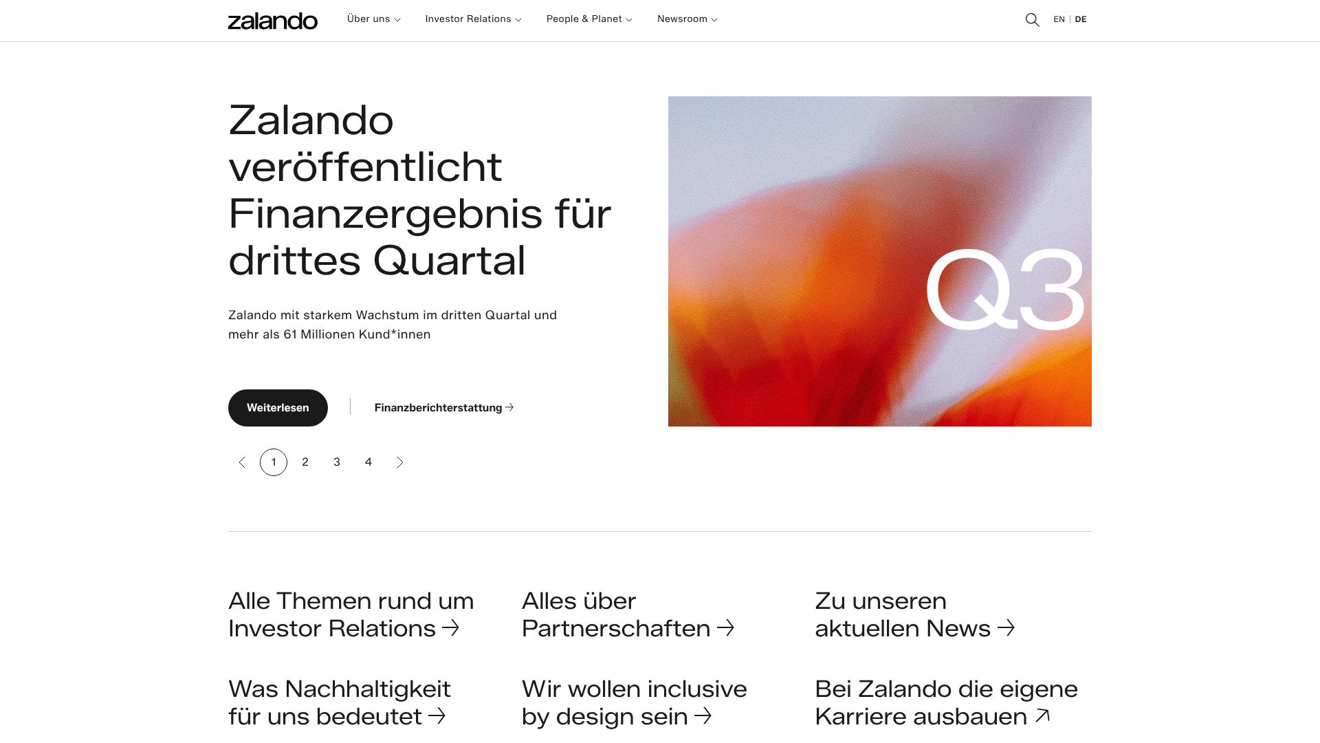 Zalando ist eine Online-Plattform für Modeartikel wie Schuhe, Bekleidung und Accessoires. Das Unternehmen ging 2014 an die Börse. Der Firmensitz des 2008 gegründeten Unternehmens befindet sich in Berlin.